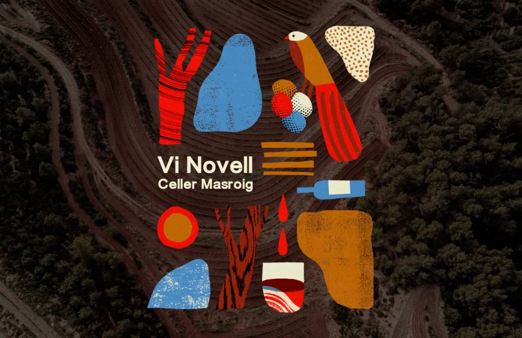 Ilustraciones y diseño de packaging para etiqueta de vino Vi Novell por Noé Aceitón